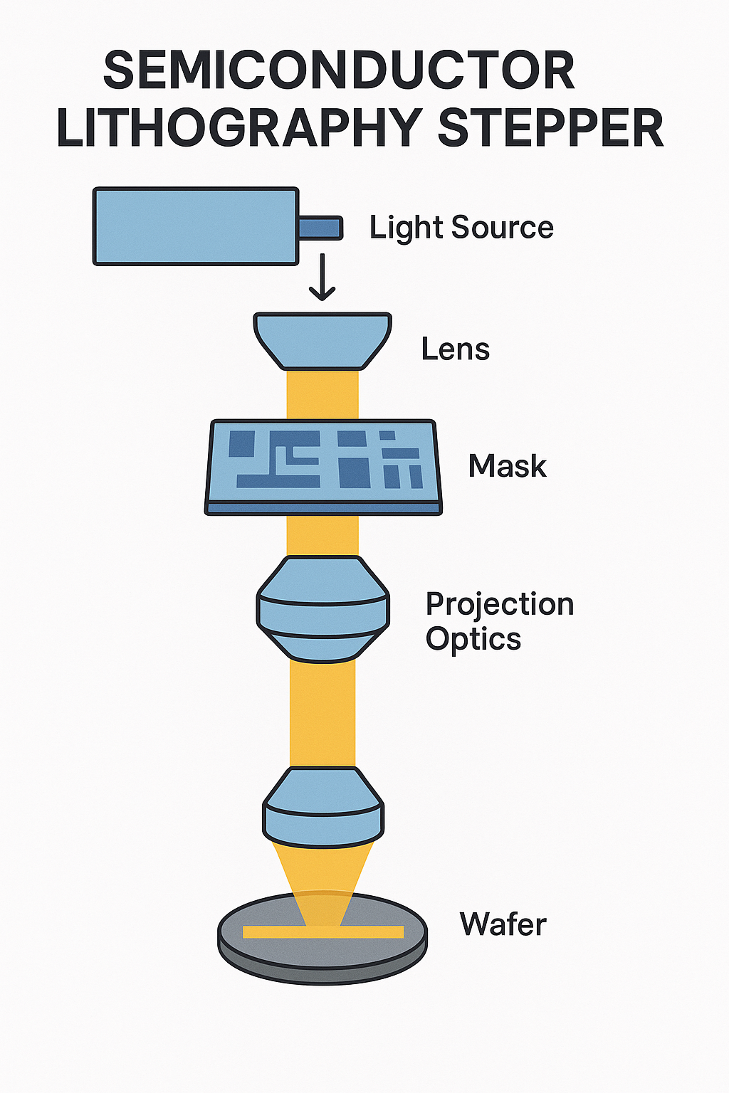 **반도체 리소그래피 스테퍼(semiconductor lithography stepper)**는 웨이퍼 위에 회로 패턴을 하나하나 순차적으로 찍어내는 노광 장비입니다. 마치 사진 인화처럼, 미세한 회로를 정밀하게 노출하는 장비로, 반도체 공정 중에서도 고정밀 기계 광학 기술이 집약된 장비입니다.